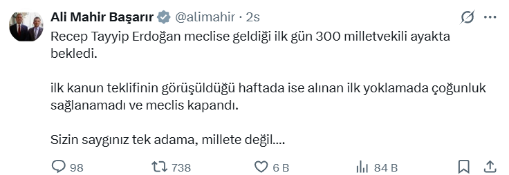 CHP Grup Başkanvekili Ali Mahir Başarır, sosyal medya hesabından yaptığı açıklamada, Meclis’in açıldığı gün 300 milletvekilinin Cumhurbaşkanı Erdoğan’ı ayakta karşıladığını hatırlatarak şunları yazdı: