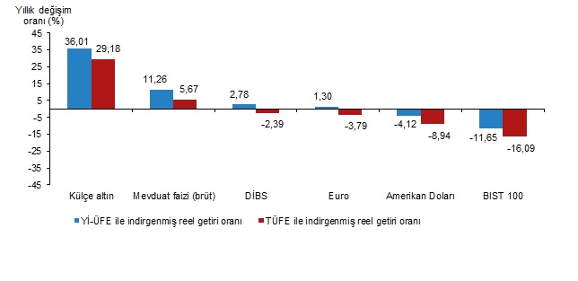 Yıllık değerlendirmede, Yİ-ÜFE ile indirgendiğinde; yatırım araçlarından mevduat faizi (brüt) %11,26, DİBS %2,78, Euro %1,30 oranlarında yatırımcısına reel getiri sağlarken; Amerikan Doları %4,12 ve BIST 100 endeksi %11,65 oranlarında yatırımcısına kaybettirdi. TÜFE ile indirgendiğinde ise mevduat faizi (brüt) %5,67 oranında yatırımcısına reel getiri sağlarken; DİBS %2,39, Euro %3,79, Amerikan Doları %8,94 ve BIST 100 endeksi %16,09 oranlarında yatırımcısına kaybettirdi.